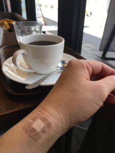 今、点滴が終わり、帰り道のカフェで一息ついているところ。